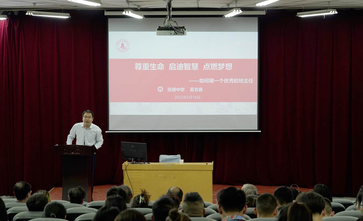 甘肃省张掖中学高级教师夏吉鑫以“尊重生命 启迪智慧 点燃梦想----如何做一个优秀的班主任”为题,从善于学习,用心待生,注重细节,勤字当先,善于创新等五个方面分享了从事班主任工作的具体做法。