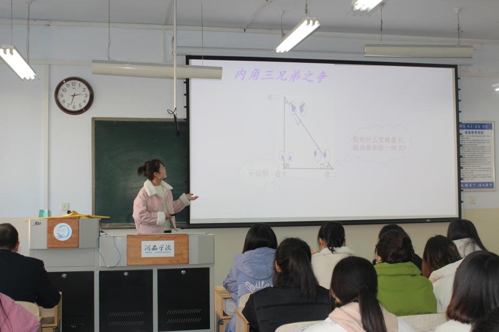 本次活动首先由数学与应用数学2018级1班常元元同学和丁月洁同学展示了课例《三角形内角和定理》和《异分母分数的加减法》的试讲,两位同学准备充分,充分展现了数学师范生的良好素质。大成公司的于海峰老师结合两位同学的课例,详细介绍了如何挖掘教材、如何撰写教案、如何磨课。甘肃省特级教师、思源实验公司的马海霞老师结合教学实际,从课堂导入、学法指导、教学资源的选取等方面对两节课进行了细致入微的点评!