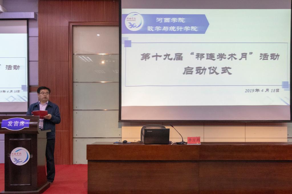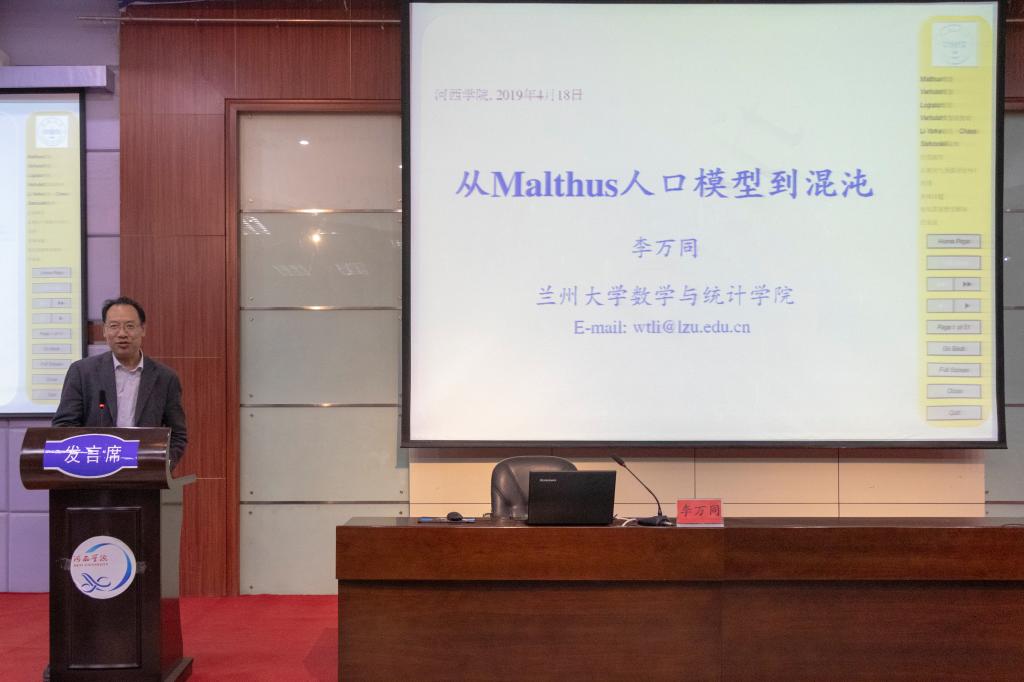 4月18日下午,公司举办第十九届“祁连学术月” 活动启动仪式暨校外专家学术报告会在公司图书馆二楼报告厅举行。兰州大学博士生导师李万同教授为全院师生作了题为“从Malthus人口模型到混沌”的学术报告。启动仪式暨报告会由公司李拓教授主持,太阳成集团tyc33455cc100多名师生聆听了报告。