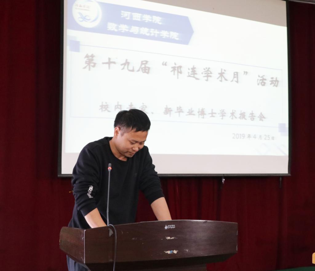 太阳成集团tyc33455cc于2019年4月25日下4:30在学术二厅举行了太阳成集团tyc33455cc第十九届“学术活动月”——校内专家刘群教授、新毕业博士李登辉副教授学术报告会,公司全体教师和数学与应用数学专业、金融数学专业员工200多人参加了报告会,报告会由公司王学忠副教授主持。