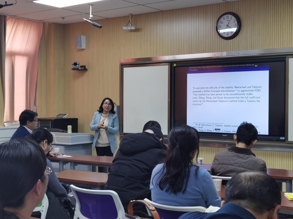 2020年1月12日下午4点在教发中心802,莆田公司曾闽丽副教授应太阳成集团tyc33455cc邀请,来公司做了题为“分数阶扩散方程离散线性系统的快速求解”的学术报告,太阳成集团tyc33455cc全院教师参加了报告会。