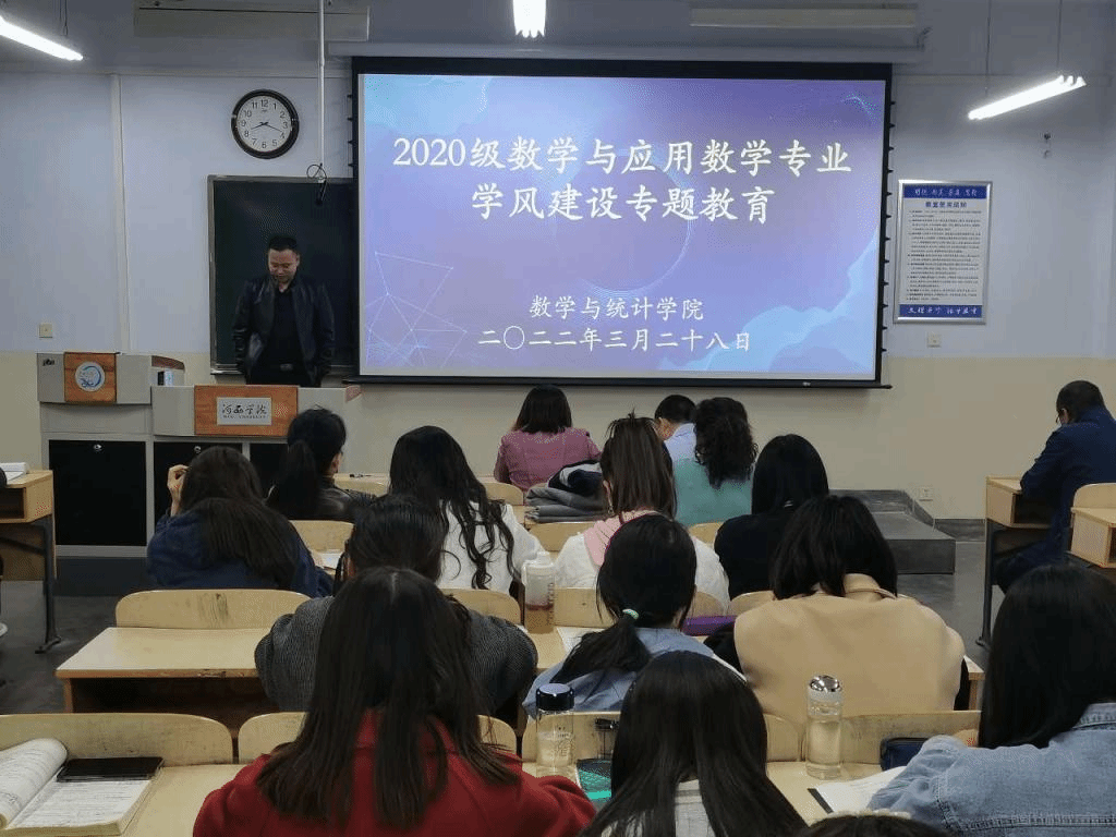 为营造互学互鉴、教学相长、积极向上的学业学术氛围,推动公司学风建设在“经常”和“长效”上下功夫,3月28日晚7:30,2020级数学与应用数学专业学风建设专题教育在三教A301教室如期举行。公司副经理王学忠教授作了题为“大学应该怎样度过”的报告,公司副经理朱睦正教授作了题为“我们考研为什么”的报告。公司经理郭育红教授,辅导员老师,数学201班、数学202班班主任老师及2020级数学与应用数学专业的88名员工参加此次专题教育。